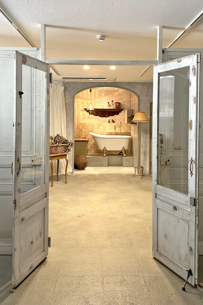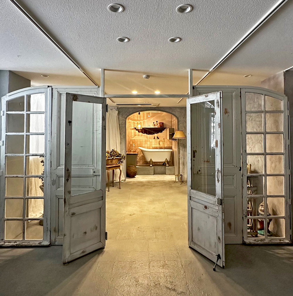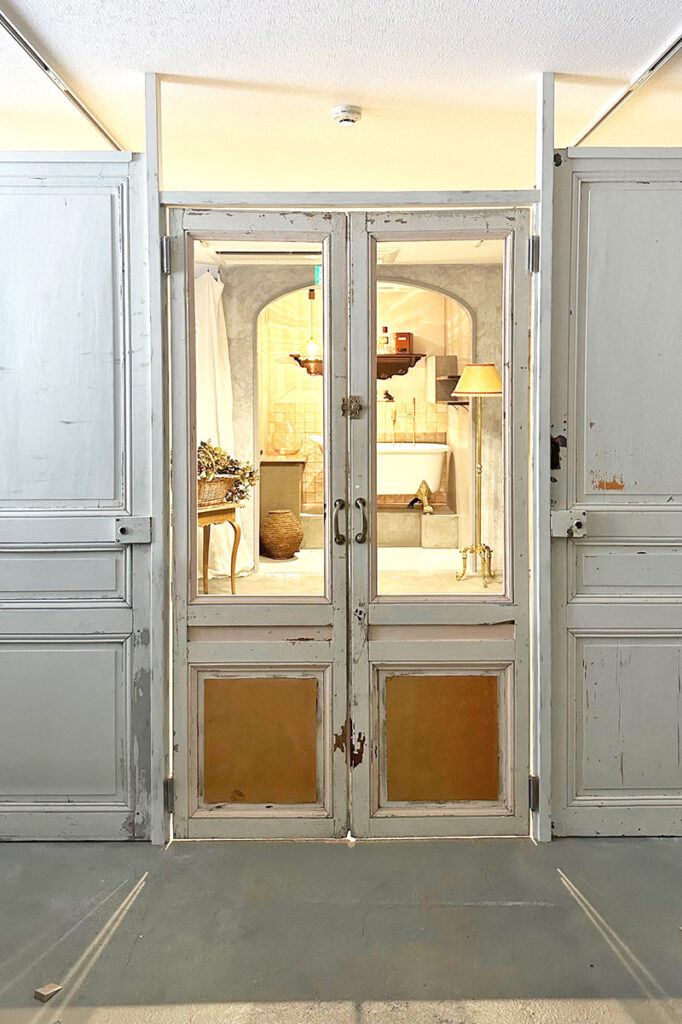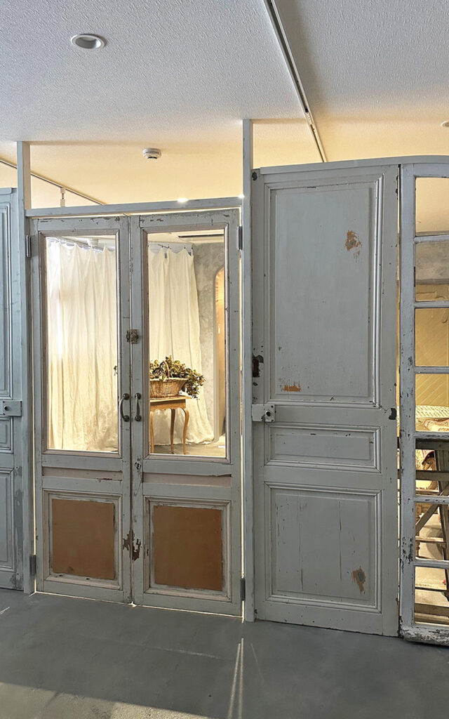 トリミングルームの入口には3種類のアンティークのドアをシンメトリーに配置