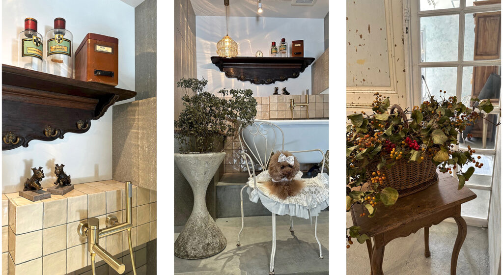また全体的に落ち着いたトーンの空間にアンティークの家具や雑貨、ドライフラワー